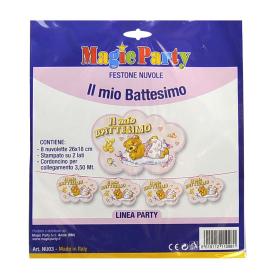 Il punto di forza di questo festone è la sua lunghezza e il suo design tematico. Realizzato in carta o cartoncino di qualità , presenta una serie di bandierine o sagome con scritte come "È Nata" o "Il Mio Battesimo", alternate a disegni delicati come carrozzine, cuori o angioletti. La lunghezza di 3,5 metri permette di decorare ampi spazi o di essere tagliato per adattarsi a diverse esigenze. Se cerchi idee festoni originali, questo è perfetto da appendere a pareti, sopra il tavolo del buffet o all'ingresso per accogliere gli ospiti. È ideale per chi vuole comprare decorazioni party online e cerca un prodotto specifico, di buon gusto e che comunichi immediatamente la natura della celebrazione.
