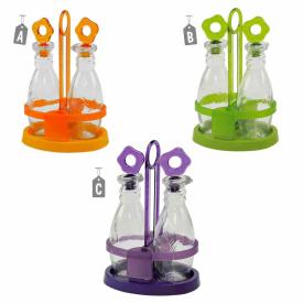 Questo set oliera e acetiera è progettato per essere comodo e funzionale. Le due ampolle in vetro trasparente, da 240 ml ciascuna, ti permettono di vedere il contenuto. I tappi dosatori in PVC colorato consentono di versare olio e aceto in modo controllato, senza sprechi. Il supporto, anch'esso in PVC colorato trasparente, non solo tiene le due bottiglie ordinate, ma funge anche da manico, permettendoti di trasportare l'intero set con una sola mano. È uno degli oliere & menage più pratici per il servizio a tavola.