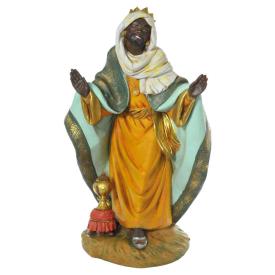 Baldassarre, spesso raffigurato con fattezze che richiamano l'Africa o l'Arabia a simboleggiare l'universalità del messaggio cristiano, porta in dono la mirra, una resina preziosa usata per l'unzione e l'imbalsamazione, prefigurazione della Passione di Cristo e riconoscimento della sua umanità . La sua posa inchinata esprime adorazione profonda e la sottomissione della sapienza e del potere terreni alla sovranità divina. Aggiungere questa figura imponente di Re Magio adorante al tuo presepe significa dare il giusto rilievo al momento dell'Epifania. È una statua che ispira profonda riverenza.