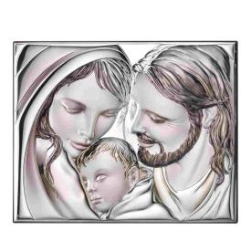 Questo quadro sacro è un capolavoro di artigianato. La base è realizzata in pregiatissimo legno di noce, mentre la decorazione centrale raffigurante la Sacra Famiglia è in argento puro. L'argento è depositato con l'innovativa tecnica dello sputtering, un metodo ecologico che garantisce una brillantezza eccezionale e duratura. I dettagli colorati aggiungono un tocco di calore e modernità all'opera.
