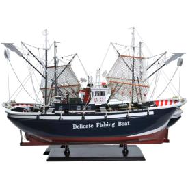 Questo peschereccio in legno è un capolavoro di modellismo. Lungo ben 122 cm, è realizzato completamente a mano da piccoli artigiani, utilizzando tecniche tradizionali. Lo scafo in legno è curato in ogni dettaglio, e la barca è arricchita da inserti in ottone, alberi, sartiame e reti da pesca, che le conferiscono un realismo straordinario. È un oggetto artistico per arredare che non solo decora, ma racconta una storia di lavoro, tradizione e passione. Perfetto per un arredamento in stile nautico, classico o industriale.