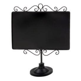 Questa lavagna da tavolo è un pezzo di design. Realizzata interamente in metallo verniciato di nero, è robusta, stabile e durevole. La sua superficie è ideale per scrivere con gessetti o pennarelli a gesso liquido. Le sue dimensioni di 35x41 cm la rendono perfetta per essere usata come segnaposto per un tavolo imperiale, per scrivere il menù del giorno in un locale, o come lavagna per i promemoria sulla scrivania. È uno di quegli accessori per la casa che uniscono un'estetica moderna a una grande praticità.