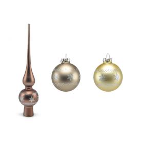 Il principale vantaggio di questo prodotto è la sua completezza. Avere palline e puntale già abbinati ti assicura un risultato cromatico e stilistico perfettamente coerente. Le tonalità del bronzo e dell'oro, arricchite da decori in glitter argento, creano un'atmosfera calda e scintillante. Le palline da 6 cm sono perfette per un albero di piccole-medie dimensioni, e il puntale da 27 cm è la conclusione perfetta. Realizzato in vetro di alta qualità , è un set di pregio per un Natale indimenticabile.