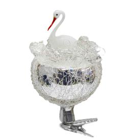 Ogni dettaglio di questo cigno in vetro è stato curato alla perfezione. Realizzato a mano in Germania, il cigno bianco puro contrasta splendidamente con il suo nido di colore argento lucido, creando un pezzo di rara bellezza. La pinza integrata lo rende un accessorio per albero di Natale estremamente versatile e facile da posizionare. Il cigno, simbolo di amore, bellezza e trasformazione, rende questo ornamento da collezione non solo un bellissimo addobbo, ma anche un portafortuna. È perfetto per temi decorativi classici, romantici o invernali, aggiungendo un tocco di poesia e nobiltà .