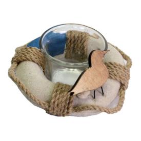 Questo portacandela è un piccolo capolavoro di creatività . La struttura principale riproduce un salvagente, rivestito in tessuto a righe beige e azzurre e decorato con una corda naturale. Al centro del salvagente è inserito un vasetto in vetro trasparente, perfetto per accogliere una candela tealight in sicurezza. Il tocco finale, che lo rende irresistibile, è un piccolo uccellino in legno (alto 4,5 cm) appollaiato sul bordo, che sembra godersi la brezza marina. L'intera composizione, con un diametro di 11 cm, è un concentrato di stile "coastal". A differenza di un comune portacandela, questo pezzo di Vacchetti è una vera e propria decorazione marina, che racconta una storia e arreda con simpatia.
