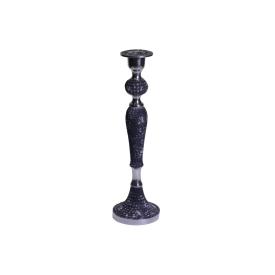 Questo portacandela è un pezzo di grande presenza. La sua struttura, alta e slanciata, è realizzata in metallo solido e presenta una classica forma tornita. A renderlo contemporaneo e unico è la finitura: un grigio scuro, non uniforme, che gli conferisce un aspetto vissuto, quasi come un pezzo recuperato da un'officina d'epoca. Con i suoi 41 cm di altezza e una base stabile di 11 cm di diametro, è perfetto per essere posizionato a terra, accanto a una libreria, o su un mobile basso per creare un forte impatto verticale. Insieme agli altri modelli della stessa linea, permette di creare composizioni scenografiche. È una decorazione luminosa che celebra la bellezza grezza del metallo.