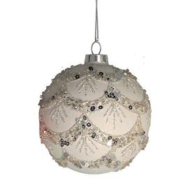 Questa pallina bianca decorata firmata Vacchetti è realizzata in vetro soffiato. A differenza delle palline lisce, la sua texture ricca di paillettes e perline cattura la luce in modo spettacolare, creando un effetto tridimensionale. Questo addobbo di Natale è perfetto per un albero in stile shabby chic, classico o per chiunque voglia aggiungere un dettaglio di lusso alle proprie decorazioni.
