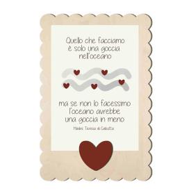 Porta un messaggio di speranza e di impegno nel mondo con questa toccante targa decorativa in legno di Angolo Idee. Realizzata in Italia e con dimensioni di 16x24 cm, questo quadretto riporta la celebre frase di Madre Teresa di Calcutta: "Quello che facciamo è solo una goccia nell'oceano, ma se non lo facessimo, l'oceano avrebbe una goccia in meno". È una decorazione da parete che ispira e un'idea regalo piena di significato.