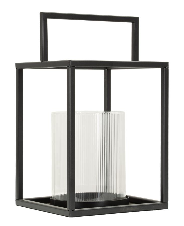 Lanterna portacandele con struttura in legno di abete, con tetto in metallo verniciato nero e pareti in vetro....