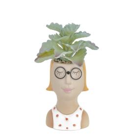 Questo vaso è un pezzo di design unico. Realizzato in ceramica smaltata, raffigura una ragazza stilizzata che indossa una canottiera e dei grandi occhiali da vista neri, un dettaglio che le conferisce un'aria da "nerd-chic" molto di tendenza. Come per gli altri vasi della linea, la sua "capigliatura" è una simpatica piantina grassa artificiale (inclusa), che crea un contrasto divertente e originale. Con i suoi 21 cm di altezza, è un complemento arredo ideale per una libreria, una scrivania in ufficio o uno studio. A differenza di un vaso anonimo, questo pezzo di Montemaggi è una decorazione pronta all'uso, che non richiede cure e porta un tocco di verde e di personalità . È perfetto per chi ama le piante ma non ha tempo di curarle.