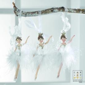 Questa ballerina decorativa sembra danzare leggera tra i rami dell'albero. I dettagli sono curatissimi: la posa dinamica, il tutù in vere piume di marabù che aggiunge morbidezza e volume, e la corona dorata glitterata che dona un tocco di luce. Questo pendente per albero di Natale non è solo un addobbo, ma un piccolo oggetto da collezione, che racconta una storia di sogni e disciplina. È una decorazione per la casa che incanta e porta un'atmosfera da favola.