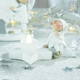 Porta la gioia e la magia del Natale nel tuo arredamento con questo simpaticissimo portacandele a forma di gnomo di Mascagni. Realizzato in resina e alto 15 cm, questo pezzo unico raffigura un allegro gnomo con un abito bianco glitterato e un lungo cappello, seduto su una base a forma di stella cometa. È la decorazione natalizia perfetta per chi cerca un oggetto che sia un portacandele, un segnaposto e una deliziosa bomboniera tutto in uno.