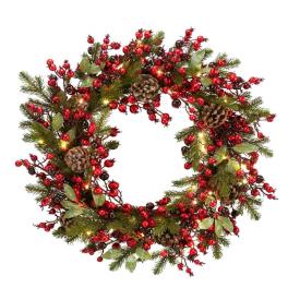 Questa favolosa ghirlanda di Natale è un trionfo di elementi festivi. La sua folta base di rami verdi artificiali è arricchita da pigne naturali e da fitti grappoli di bacche rosse. Il tocco magico è dato dalle lucine a LED a luce bianca calda, già intrecciate tra i rami, che creano un'atmosfera calda e accogliente. Con un diametro di 60 cm, è perfetta come fuoriporta natalizio o come centrotavola. Funziona a batterie, quindi non avrai bisogno di prese elettriche vicine.