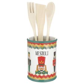 Organizza la tua cucina con un tocco di magia e di tradizione grazie a questo originale set portamestoli "Schiaccianoci" di Montemaggi. Realizzato in robusta ceramica stoneware, il set include un capiente barattolo contenitore e tre utensili da cucina (paletta, mestolo e forchettone) con manico in legno. La decorazione con i classici soldatini schiaccianoci lo rende un accessorio da cucina festivo e un'ottima idea regalo per il periodo natalizio.