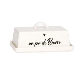 Realizzata in robusta ceramica gres di colore bianco, questa burriera si distingue per la sua resistenza e il suo design pulito. La base è perfettamente dimensionata per ospitare un panetto di burro standard, mentre il coperchio assicura una chiusura ottimale, proteggendo il contenuto da aria e odori esterni e mantenendone inalterate la freschezza e la consistenza. La giocosa scritta nera "un po' di burro" aggiunge un tocco di personalità . Un barattolo per la conservazione degli alimenti che è anche un delizioso accessorio da tavola.