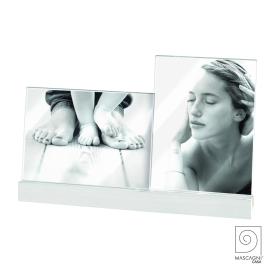 Il design di questa cornice multipla è unico e intelligente. La base in legno laccato bianco è dotata di due scanalature parallele, nelle quali puoi inserire le due cornici in acrilico trasparente (per foto 13x18 cm) come preferisci. Puoi metterle vicine, distanti, sfalsate, una davanti all'altra, e orientarle sia in verticale che in orizzontale. È un portafoto di design che ti permette di giocare con le forme e i ricordi, creando una scultura sempre nuova.