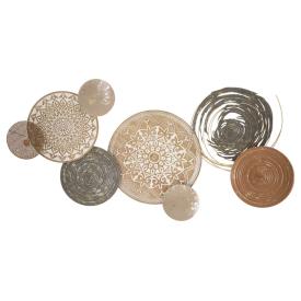 Il pannello 'Boho' è una scultura murale che affascina per la sua complessità. La sua struttura è un grande assemblaggio di forme circolari e motivi che ricordano i mandala orientali, creando un effetto di grande armonia e spiritualità. Realizzato in ferro, con finiture probabilmente multicolore o con tocchi dorati, gioca con la luce e proietta sulla parete un affascinante disegno di ombre. A differenza di un quadro, questo pannello 3D è un pezzo che respira. Le sue dimensioni enormi, quasi 168 cm di larghezza, lo rendono perfetto per la parete principale di un soggiorno, di un centro yoga o di uno spazio che vuole comunicare benessere.