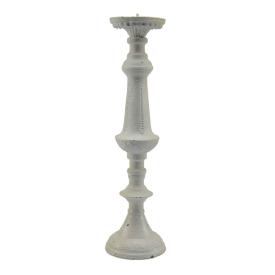Questo portacandela è un pezzo forte. La sua struttura alta, realizzata in metallo solido, ha una classica forma tornita che evoca i candelabri di un tempo. Ciò che lo rende speciale è la finitura in bianco anticato: la vernice è volutamente irregolare, a tratti scrostata, per conferire all'oggetto un aspetto autenticamente vintage e pieno di personalità . Con i suoi 43 cm di altezza, è perfetto per essere posizionato a terra, accanto a una poltrona o a un camino, o su un mobile basso per creare un forte impatto verticale. Abbinato al suo modello più piccolo, permette di creare una composizione dinamica e di grande effetto. È una decorazione luminosa che da sola riesce a definire lo stile di un angolo della casa.