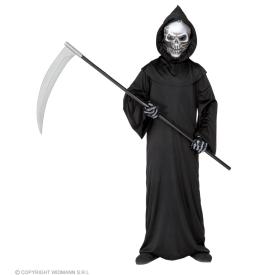 Questo costume bambino è un kit completo per un look da incubo. Include una lunga tunica nera in poliestere con maniche ampie e frastagliate, un cappuccio profondo che nasconde il volto, guanti neri e una maschera da teschio, a volte con effetto olografico per uno sguardo ancora più spettrale. Se cerchi idee costumi bambini originali, questo è un classico che si può arricchire con una falce (non inclusa). � ideale per chi vuole comprare costumi bambini online e cerca un travestimento completo, che trasformi il proprio figlio nel signore della notte di Halloween.