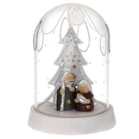 Questa affascinante Natività stilizzata è composta da figure in metallo dalle linee pulite, che rappresentano la Sacra Famiglia. La composizione, alta 11,5 cm, è custodita sotto una cupola di vetro che la protegge e ne esalta la raffinatezza. È una decorazione natalizia ideale da posizionare su un mobile, una mensola o un comodino, per creare un piccolo angolo di contemplazione e pace durante le festività . Un pezzo che celebra il vero significato del Natale.