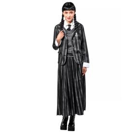 Questo costume da Mercoledì Addams per donna è un set completo e di alta qualità . Include la giacca a righe con lo stemma della Nevermore, la gonna coordinata e la finta camicia con cravatta. Realizzato in poliestere, è comodo e resistente. Essendo un prodotto con licenza ufficiale, garantisce la massima fedeltà al design della serie TV. È una scelta eccellente da comprare online per chi cerca idee costumi adulti originali e non vuole scendere a compromessi.