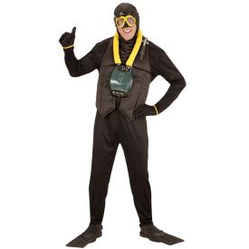 Questo costume da sub è stato pensato per un look completo e facile da indossare. Il set include una tuta intera, un cappuccio che simula un casco da palombaro e dei copriscarpe a forma di pinne. Realizzato in poliestere, è comodo e leggero. È una soluzione "tutto in uno" ideale da comprare online per chi cerca idee costumi adulti originali e vuole un travestimento che si faccia notare per la sua creatività .