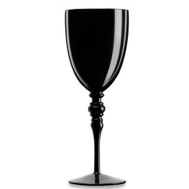 Realizzato in vetro in pasta di colore, questo calice presenta un nero pieno e profondo, che non teme l'usura. La dicitura "decorato a mano" ne attesta il valore aggiunto, rendendo ogni pezzo unico e prezioso. La capacità di 400 ml e la forma classica lo rendono adatto a servire sia vini rossi che bianchi, creando un affascinante e misterioso contrasto visivo. Un calice di design che è l'emblema di un lusso alternativo e sofisticato.