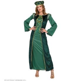 Questo costume da dama medievale è stato disegnato per un look autentico e una vestibilità comoda. L'abito lungo in poliestere effetto velluto ha un design che valorizza la figura, con una cintura e un copricapo coordinati. I colori verde e oro sono tipici della nobiltà dell'epoca. È un'ottima soluzione da comprare online per chi cerca idee costumi adulti originali e vuole un travestimento completo e di classe.