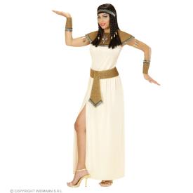 Questo costume da regina egiziana è stato pensato per un look completo e sontuoso. Il set include un lungo abito bianco, un collare dorato, una cintura e dei bracciali. Realizzato in poliestere, è comodo e valorizza la figura. È una soluzione "tutto in uno" ideale da comprare online per chi cerca idee costumi adulti originali e vuole un travestimento che non passi inosservato.