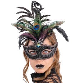 La nostra maschera di carnevale è un accessorio di lusso. La base nera è riccamente decorata con strass e glitter che creano un gioco di luci ipnotico. Una sontuosa composizione di piume nere laterali aggiunge un tocco di teatralità e raffinatezza. Realizzata in poliestere e materiali leggeri, è confortevole da indossare e si fissa facilmente. È una delle idee maschere originali più spettacolari, pensata per chi vuole un accessorio che sia il vero protagonista dell'outfit.