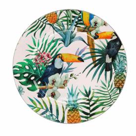 Realizzata in PVC resistente e durevole, questa tovaglietta rotonda è pensata per unire un'estetica d'impatto a una grande facilitàdi manutenzione. Protegge il tavolo da macchie e graffi e si pulisce in un attimo con un panno umido. Il design è un tripudio di natura esotica, con foglie tropicali e un coloratissimo tucano che diventa il protagonista della tavola. Con un diametro di 33 cm, è un perfetto sottopiatto decorativo che aggiunge colore e allegria.