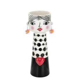 Porta un'ondata di colore e di dolcezza nella tua casa con questo adorabile vaso in ceramica di Montemaggi. Alto 17,5 cm, questo vaso a forma di viso raffigura una ragazza con un abito a pois, grandi orecchini floreali e una collana con un ciondolo a forma di cuore. È un soprammobile di design perfetto per chi ama lo stile giocoso e cerca un oggetto che sia un'esplosione di allegria.