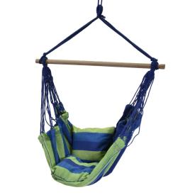 Questa sedia a dondolo sospesa è un invito al riposo. Realizzata in robusto tessuto di cotone e poliestere, presenta una vivace fantasia a righe blu e verdi, che porta allegria in ogni spazio. La solida barra di supporto in legno garantisce una distribuzione ottimale del peso e la massima sicurezza. Il comfort è assicurato dai **due cuscini inclusi**, che rendono la seduta ancora più morbida e accogliente. Questa amaca a poltrona è perfetta da appendere a un ramo robusto, a una trave del portico o a un apposito supporto.