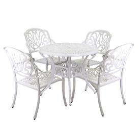 Il set Maryland è un trionfo di robustezza e stile. L'intero completo, sia il tavolo che le poltrone, è realizzato in alluminio pressofuso, una tecnica che permette di creare forme complesse e decorate garantendo al contempo una soliditàe una resistenza eccezionali. La verniciatura a polvere (poliestere) bianca protegge l'alluminio dalla corrosione e dagli agenti atmosferici, assicurando una bellezza che dura nel tempo. Le quattro poltrone con braccioli offrono una seduta comoda e avvolgente. A differenza di altri set in ferro, questo in alluminio è molto più leggero e non arrugginisce, rendendolo uno dei set da pranzo per esterno più pratici e durevoli disponibili nell'arredo giardino online.