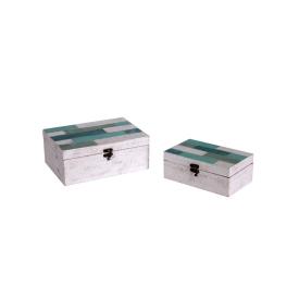 Questo set di scatole è composto da due pezzi rettangolari di dimensioni a scalare, che possono essere riposti l'uno dentro l'altro. Sono realizzate in legno, con una stampa a tema marino. Dotate di coperchio, sono perfette per riporre accessori o come scatole regalo di lusso. Sono uno di quei cesti e contenitori che uniscono la massima praticità a un'estetica ricercata.