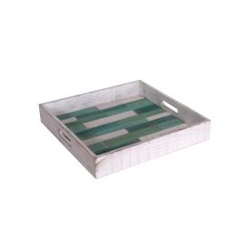 Il vassoio quadrato Mare è un esempio di design a tema. Realizzato in legno MDF, offre una superficie liscia e facile da pulire. Il suo design è il protagonista: una base bianca arricchita da una cornice e da decorazioni a tema marino nei toni del verde e dell'azzurro, che creano un look fresco e rilassante. I comodi manici laterali lo rendono facile da spostare. Con le sue dimensioni di 37x37 cm, è un vassoio da servizio ideale per la colazione, ma anche un magnifico centrotavola o svuotatasche.