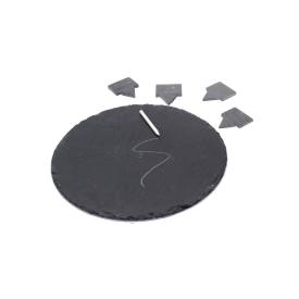 Questo piatto da portata è realizzato in ardesia naturale, un materiale elegante, igienico e perfetto per mantenere la temperatura ideale di formaggi e salumi. Il suo design rotondo con un diametro di 30 cm offre un'ampia superficie per le tue creazioni culinarie. La vera genialata, però, sono le 4 targhette segnagusto a forma di fumetto, anch'esse in ardesia, su cui puoi scrivere con un gessetto il nome dei piatti, messaggi divertenti o gli ingredienti principali. � il tagliere per formaggi e salumi perfetto per aperitivi, feste e cene a buffet, un pezzo di design che stimola la convivialitàe rende ogni occasione speciale.