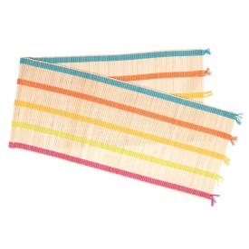 Il runner in bambù si distingue per la sua lavorazione. � realizzato con sottili listarelle di bambù, tinte in diversi colori e intrecciate tra loro per creare un motivo a righe o a scacchi multicolor. Con le sue dimensioni di 33x150 cm, è perfetto per un tavolo da pranzo o un tavolino. A differenza dei runner in tessuto, questo modello offre una superficie più rigida e facile da pulire con un panno umido. � l'ideale per un'apparecchiatura informale, per un pranzo all'aperto o per un arredo in stile etnico o fusion.