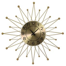 Questo orologio di design è una vera e propria scultura da muro. La sua struttura è interamente realizzata in metallo con una finitura dorata. Il design è "aperto" e leggero: un doppio anello esterno funge da cornice, mentre dodici raggi sottili indicano le ore, convergendo verso il centro dove si trovano le eleganti lancette. Questo stile "scheletrico" permette alla parete di diventare parte dell'orologio, creando un effetto arioso nonostante le grandi dimensioni. Questo orologio da muro è perfetto per un arredo moderno, classico o art déco.
