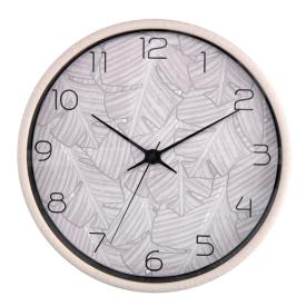 Questo orologio di design è un invito alla tranquillità. La sua cornice è realizzata in plastica di alta qualitàin un color beige neutro. Il quadrante, protetto da un vetro, è decorato con una stampa di foglie stilizzate, sempre nei toni del beige, creando un effetto tono su tono molto raffinato. I numeri arabi e le lancette, di un marrone a contrasto, garantiscono un'ottima leggibilità. Questo orologio da muro è l'ideale per un arredo in stile naturale, scandinavo o per chiunque ami i motivi botanici.