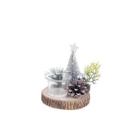 Il portacandela Sylvia è una ricca composizione che celebra l'inverno. La base è un trionfo di elementi naturali come pigne e rami di pino, sapientemente assemblati e arricchiti da un effetto "neve" che li rende ancora più suggestivi. Al centro, un supporto in vetro accoglie la candela, la cui fiamma si rifletterà tra i dettagli innevati, creando un'atmosfera calda e fiabesca. Questo portacandela natalizio è la decorazione di Natale ideale per la tavola, la mensola del camino o una credenza.