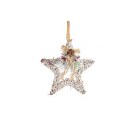 Il pendaglio Nelson è un concentrato di atmosfera. � realizzato con un intreccio di rametti naturali e polistirene, che formano una stella tridimensionale. La superficie è decorata con pigne, bacche rosse artificiali e un realistico effetto neve, che conferisce alla decorazione un aspetto autentico e vissuto. Questo appendino natalizio non è il solito addobbo, ma un pezzo che porta con sé la bellezza del bosco in inverno. � perfetto per dare un tocco materico e naturale al tuo albero.