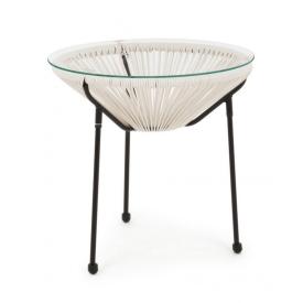 Il tavolino da esterno Parker è un esempio di design intelligente e curato. La struttura a tre gambe è realizzata in acciaio sabbiato e verniciato a polvere epossidica, un processo che garantisce un'elevata resistenza alla corrosione e una finitura bianca impeccabile. L'elemento distintivo è l'intreccio di corde in fibra sintetica (PE 4mm) che avvolge la struttura, creando un gioco di pieni e vuoti di grande effetto. Il piano d'appoggio è un elegante disco di vetro temperato da 5 mm di spessore, sicuro e facile da pulire. Con un diametro di 50 cm, questo tavolino con piano in vetro ha le dimensioni perfette per fungere da appoggio.
