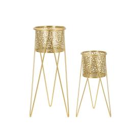 Il set di portavasi Glod è un pezzo di grande personalità . La struttura di supporto di ogni pezzo è realizzata in ferro con una finitura nera, che garantisce stabilità e un look industriale. I vasi, in ceramica, sono di un color oro brillante, creando un contrasto audace e di grande effetto con il metallo nero. Il set include due portavasi di altezze differenti, perfetti per essere accostati per creare un angolo verde dinamico. Questi vasi e portavasi sono un tocco di lusso per ogni ambiente.
