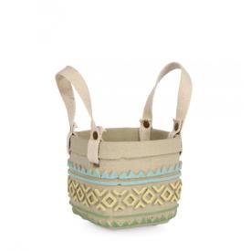 Il vaso intrecciato Uruguay è un esempio di design naturale. Realizzato a mano, presenta una struttura interna in metallo che ne garantisce la forma, rivestita da un intreccio in fibra di giacinto d'acqua. La sua caratteristica distintiva è il motivo a righe colorate (azzurro, bianco e verde) che ne decora la superficie. I due manici laterali, anch'essi in fibra intrecciata, non sono solo decorativi, ma lo rendono anche facile da spostare. L'interno è dotato di un rivestimento in PVC per proteggere l'intreccio. � un portavaso che arreda con la sua sola presenza.