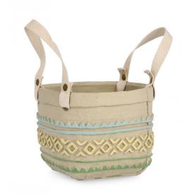 Il vaso intrecciato Uruguay è un esempio di design naturale. Realizzato a mano, presenta una struttura interna in metallo che ne garantisce la forma, rivestita da un intreccio in fibra di giacinto d'acqua. La sua caratteristica distintiva è il motivo a righe colorate (azzurro, bianco e verde) che ne decora la superficie. I due manici laterali, anch'essi in fibra intrecciata, non sono solo decorativi, ma lo rendono anche facile da spostare. L'interno è dotato di un rivestimento in PVC per proteggere l'intreccio. � un portavaso che arreda con la sua sola presenza.