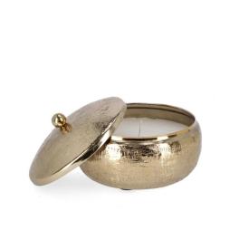 La candela con coperchio Lathe Bomb è un'esperienza di lusso. Le sue dimensioni generose e la lavorazione del vetro, che ricorda una tornitura artigianale, la rendono un oggetto prezioso. Una volta accesa, la fiamma (o le fiamme, dato il diametro) danza riflettendosi sulla superficie dorata, creando un'atmosfera calda e scintillante. La cera di alta qualità rilascia una fragranza ricca e persistente, che avvolge l'ambiente. Il coperchio coordinato permette di proteggere la candela con eleganza. Una volta esaurita, il suo vaso si trasforma in un pezzo d'arredo magnifico, un simbolo di gusto e raffinatezza.