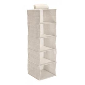 Massimizza l'organizzazione del tuo armadio con l'Organizer da Appendere a 5 tasche Tidy di Bizzotto. Questo capiente contenitore porta tutto in tessuto beige è un complemento d'arredo che trasforma lo spazio verticale inutilizzato in una pratica cassettiera sospesa. � la soluzione definitiva per chi cerca un modo per riporre maglioni, borse, scarpe e accessori in modo ordinato e visibile, portando un nuovo livello di funzionalità nel proprio arredo casa.