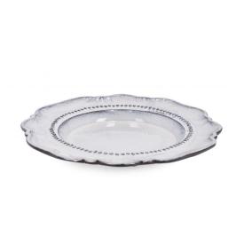 Alzata porta dolci in metallo verniciato di colore argento lucido, con bordo ricamato e due piani con specchio...