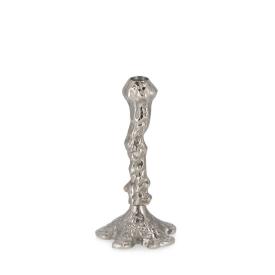 Questo portacandela di design è un capolavoro di matericità . Realizzato interamente in alluminio, si distingue per la sua forma organica e per la sua superficie lavorata, che crea un effetto texturizzato di grande fascino. La finitura in una brillante e fredda tonalità argento ne esalta le forme e riflette la luce dell'ambiente, rendendolo un oggetto incredibilmente luminoso. Con i suoi 21 cm di altezza, è ideale per una candela a colonna e perfetto come centrotavola natalizio, su una mensola del camino o su una consolle.
